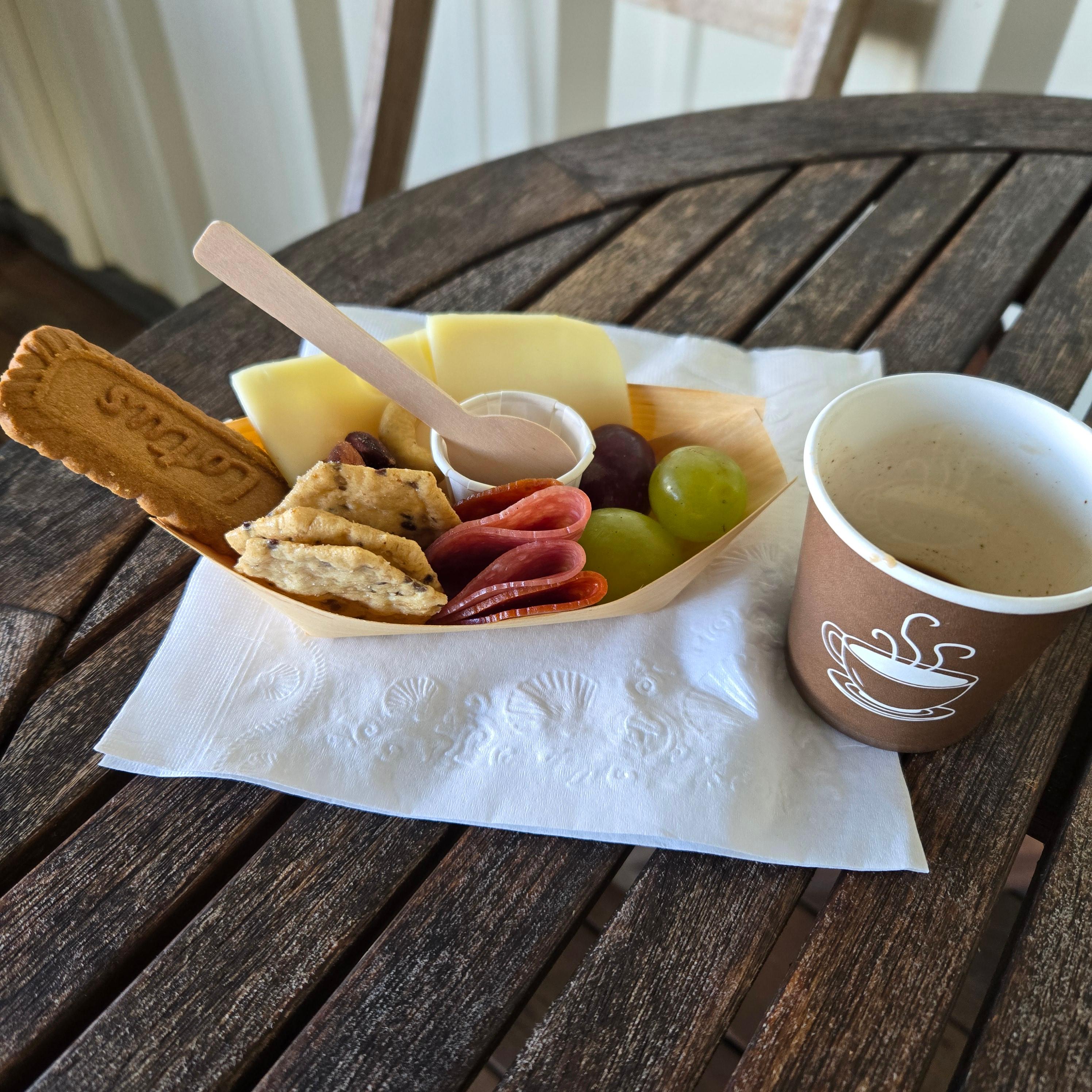 약간의 스낵을 준비해 주심. 핫초코와 크래커 그리고 치즈와 과일 조금.