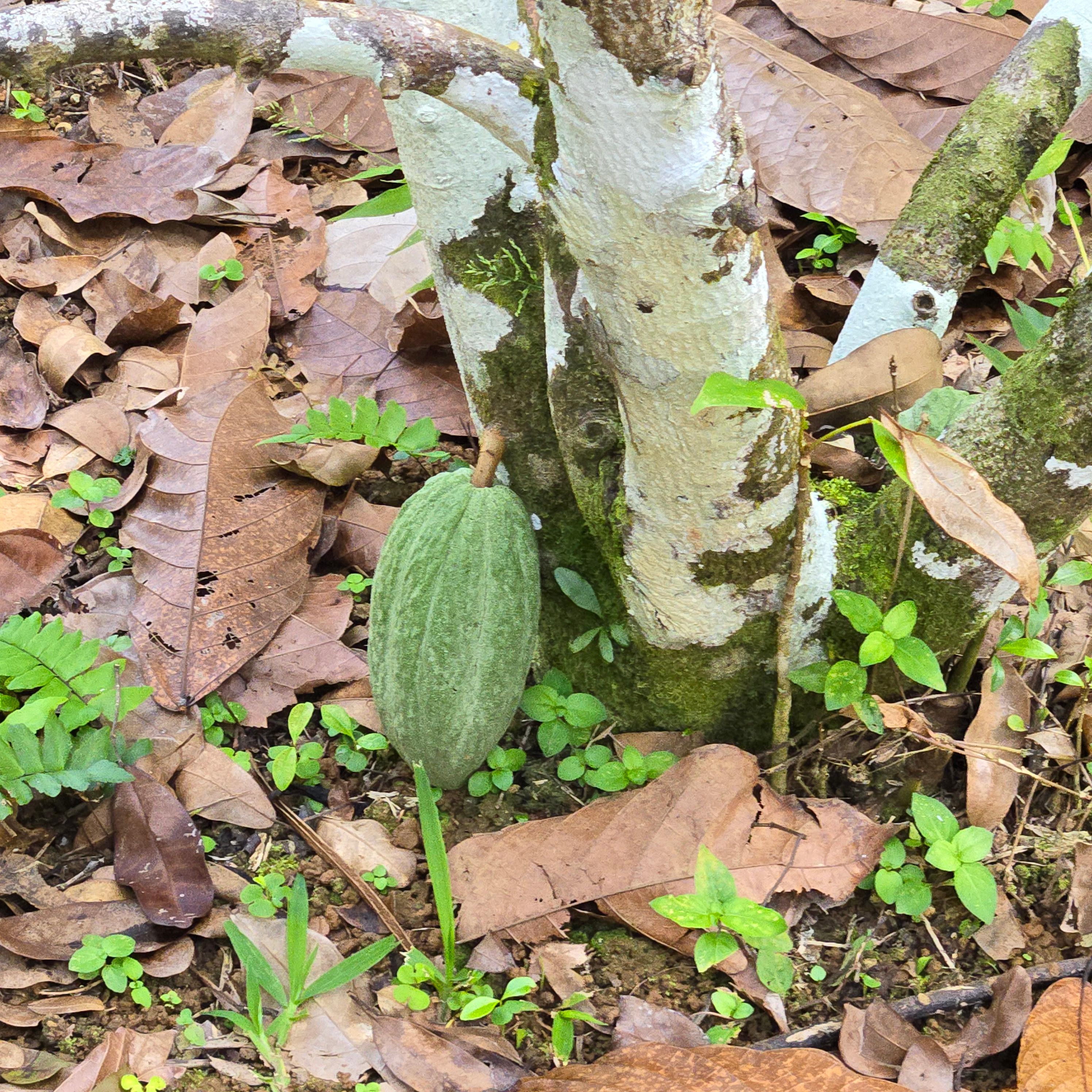 카카오 열매는 나뭇가지에 나기도 하지만 기둥에 나기도 한다고.
